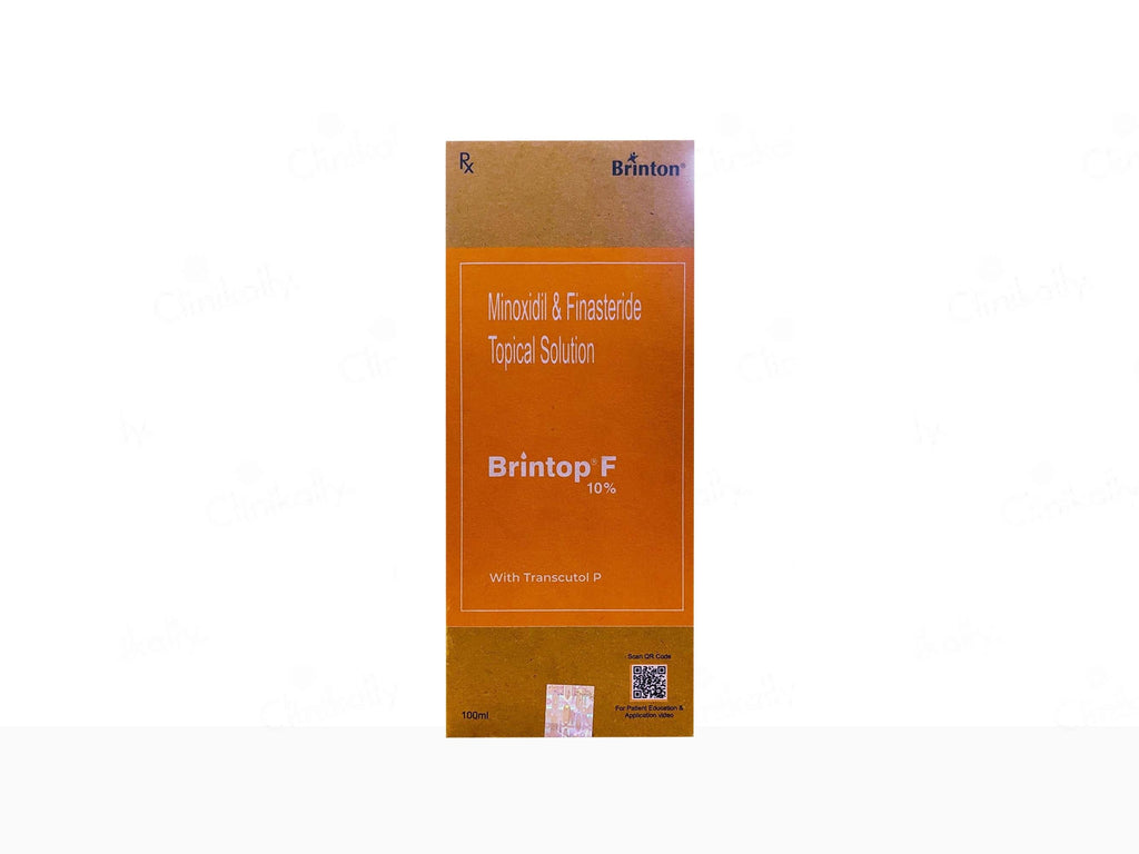 In Treatment of Hair loss Brintop F 10% Solution is a medicine used to treat common hereditary hair loss in men. It prevents further hair loss and helps hair to regrow. It increases blood flow to the hair follicles on your scalp, which prevents hair cell death and also enhances new hair growth. It also stops production of a hormone that causes excessive hair fall or baldness and also increases hair growth. It is most effective for baldness or thinning at the top of the scalp but less effective at the front or for receding hairline. Benefits are less likely if you have been bald for many years or have a large area of hair loss. Brintop F 10% Solution is not suitable for sudden or unexplained hair loss. It is considered as a safe medicine. However, hair that has regrown may disappear after a few months. Regrowth of hair can be beneficial to your mood, self-esteem as well as your appearance, but you need to use it regularly to get the benefits. This product is meant only for men and should not be used in women.